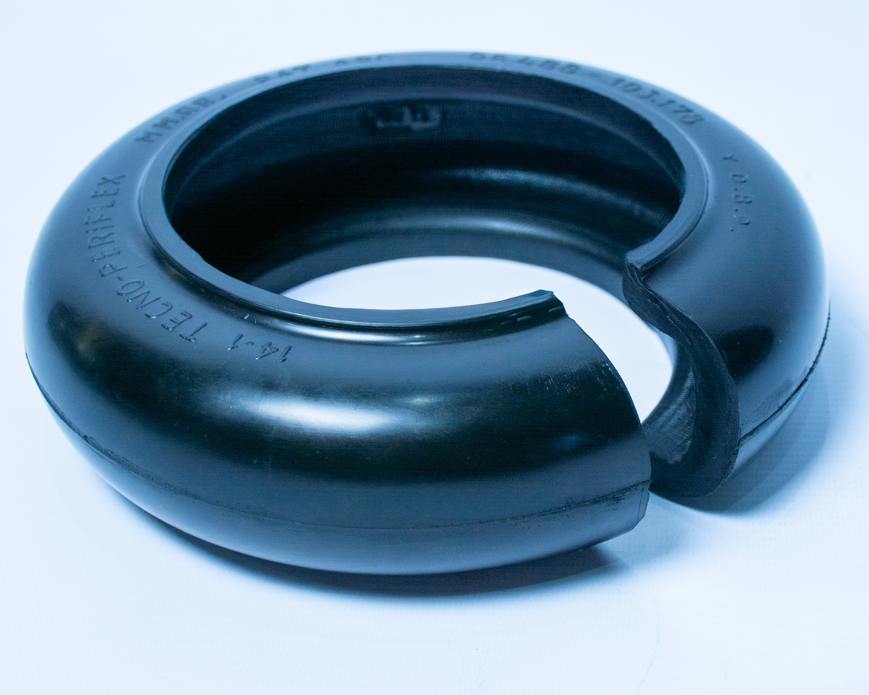Banda toroidal de elastómero y telas, partida, con aros prensadores independientes.